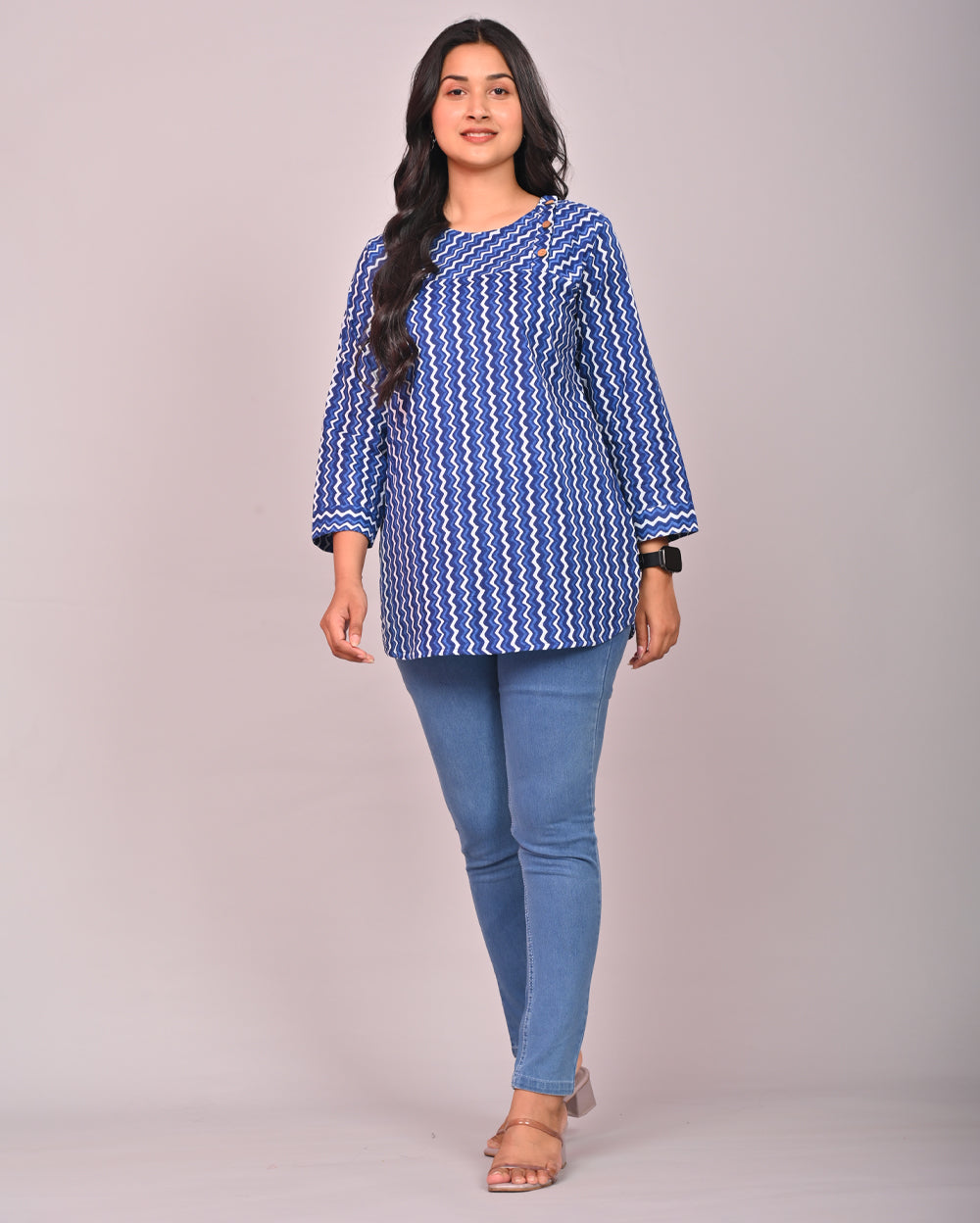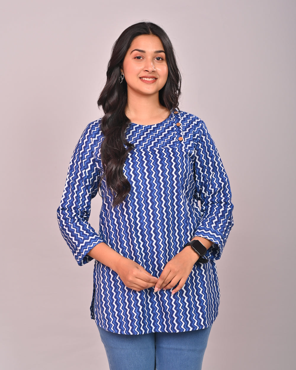 Blue Zig Zag Cotton Block Printed Tops