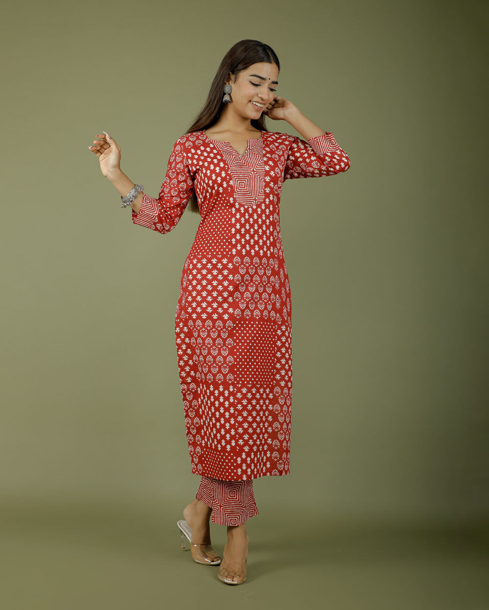 Cherry Multi Design Hand block Printed Cotton Kurti Pant Set