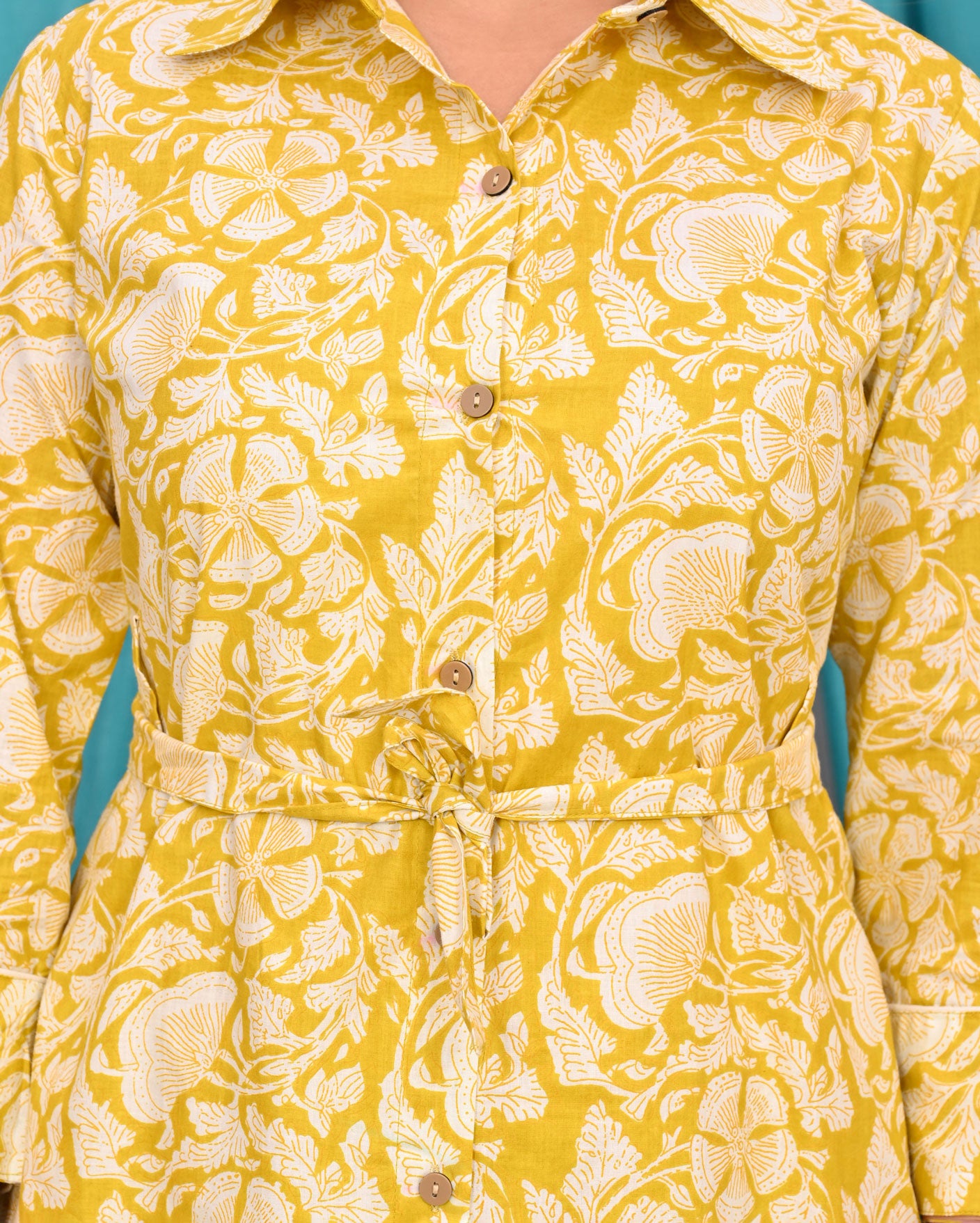 Are you Looking for a summer kurta that's both stylish and comfortable? This Cotton Printed Co-Ord set is just what you need. It's well-fitted, with Shirt Syle and three-quarter sleeves, and features hand-printed border detailing.