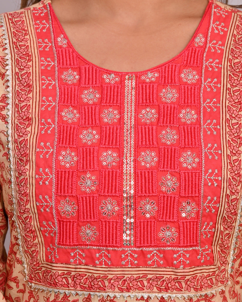 This kurta set With Dupatta is perfect for dressing up or down. The kurta is made of cotton and is printed with a beautiful design. It has a round neck and Gota Patti Work detail. The Bottom is made of Cotton fabric and is a lovely contrast to the kurta. Style this set with oxidized jewelry and a pair of ethnic chappals. You'll feel uniquely gorgeous!