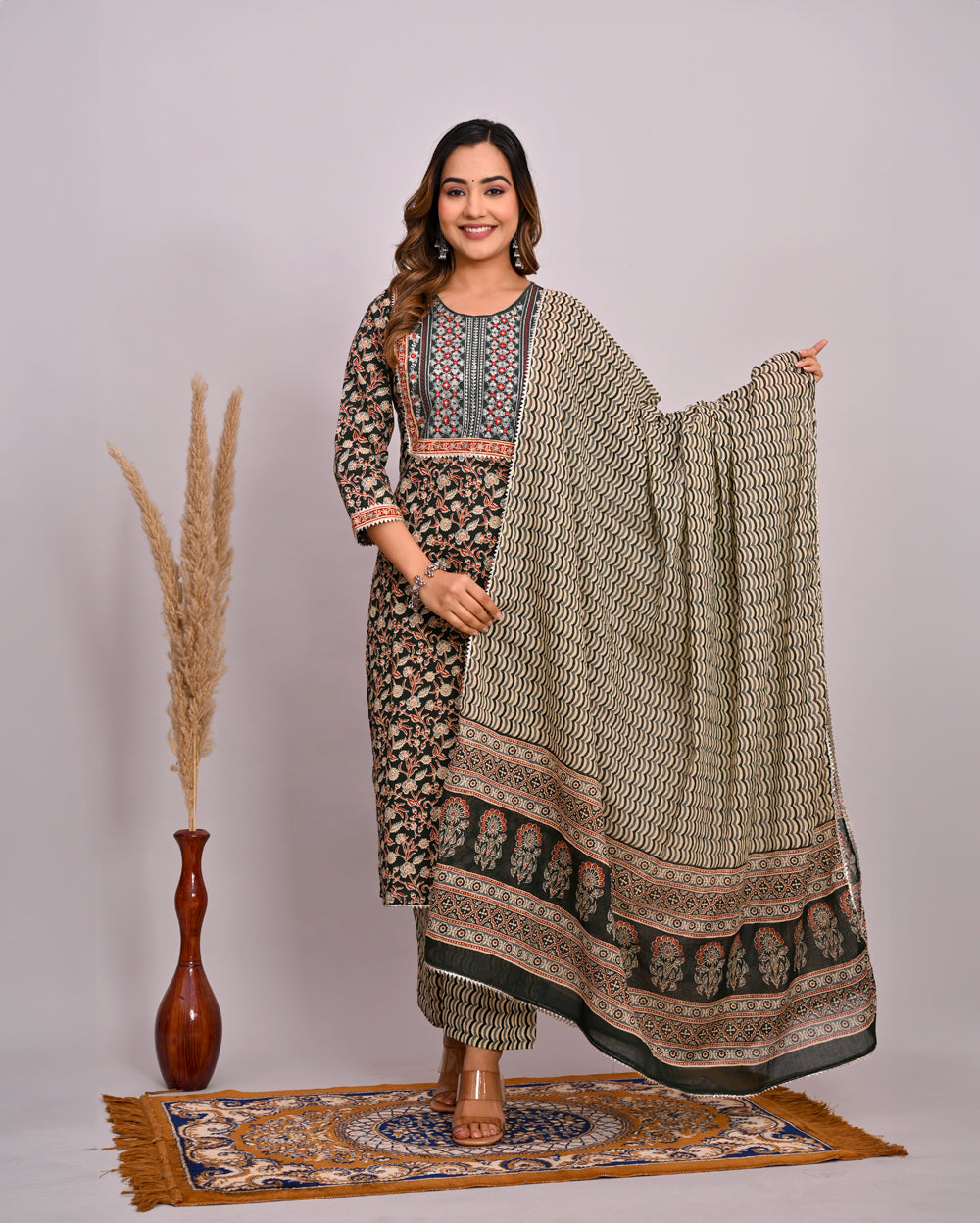 This kurta set With Dupatta is perfect for dressing up or down. The kurta is made of cotton and is printed with a beautiful design. It has a round neck and Gota Patti Work detail. The Bottom is made of Cotton fabric and is a lovely contrast to the kurta. Style this set with oxidized jewelry and a pair of ethnic chappals. You'll feel uniquely gorgeous!