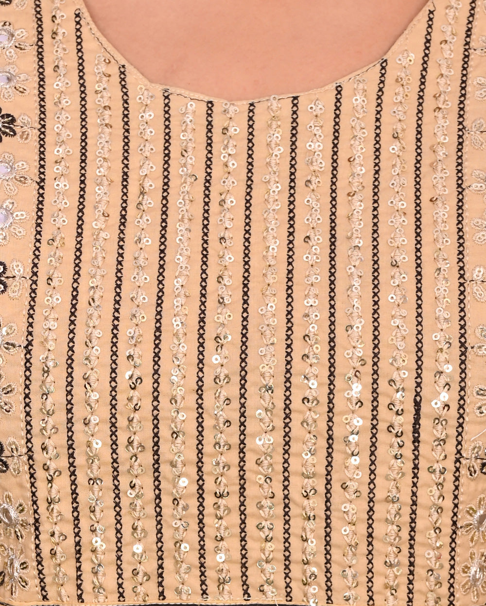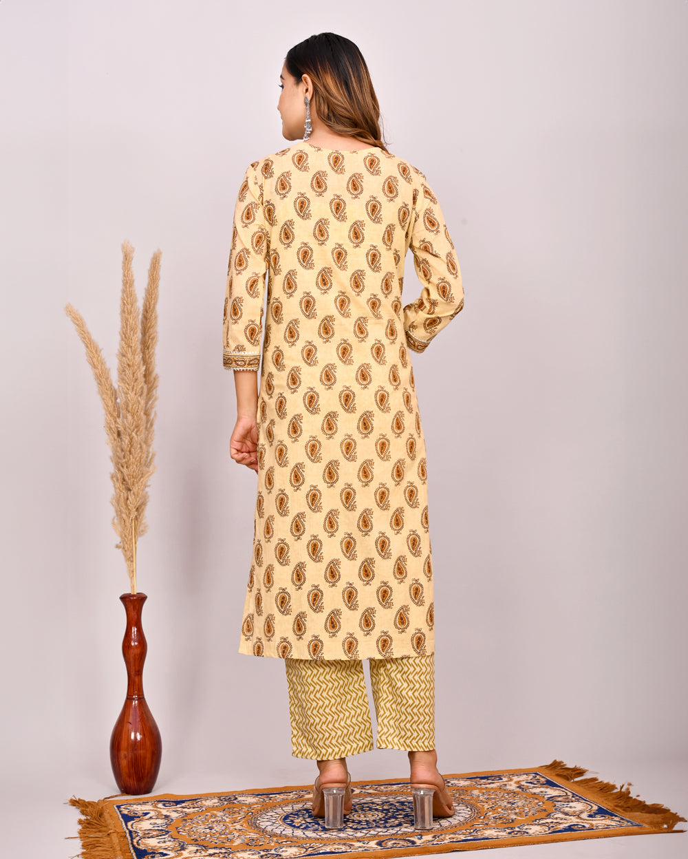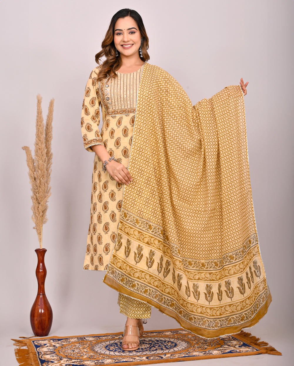 This kurta set With Dupatta is perfect for dressing up or down. The kurta is made of cotton and is printed with a beautiful design. It has a round neck and Gota Patti Work detail. The Bottom is made of Cotton fabric and is a lovely contrast to the kurta. Style this set with oxidized jewelry and a pair of ethnic chappals. You'll feel uniquely gorgeous!