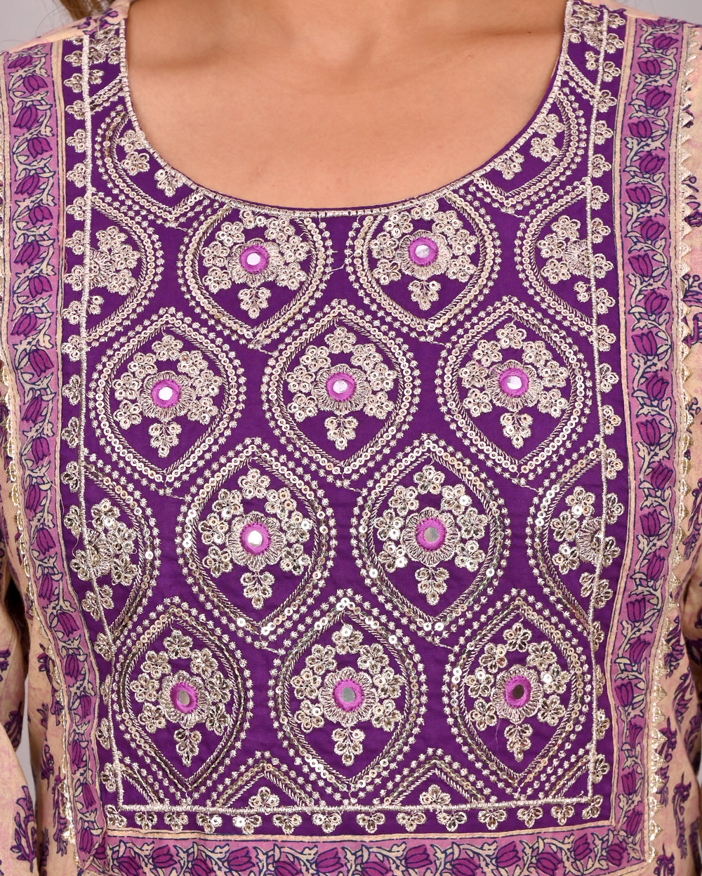 This kurta set With Dupatta is perfect for dressing up or down. The kurta is made of cotton and is printed with a beautiful design. It has a round neck and Gota Patti Work detail. The Bottom is made of Cotton fabric and is a lovely contrast to the kurta. Style this set with oxidized jewelry and a pair of ethnic chappals. You'll feel uniquely gorgeous!