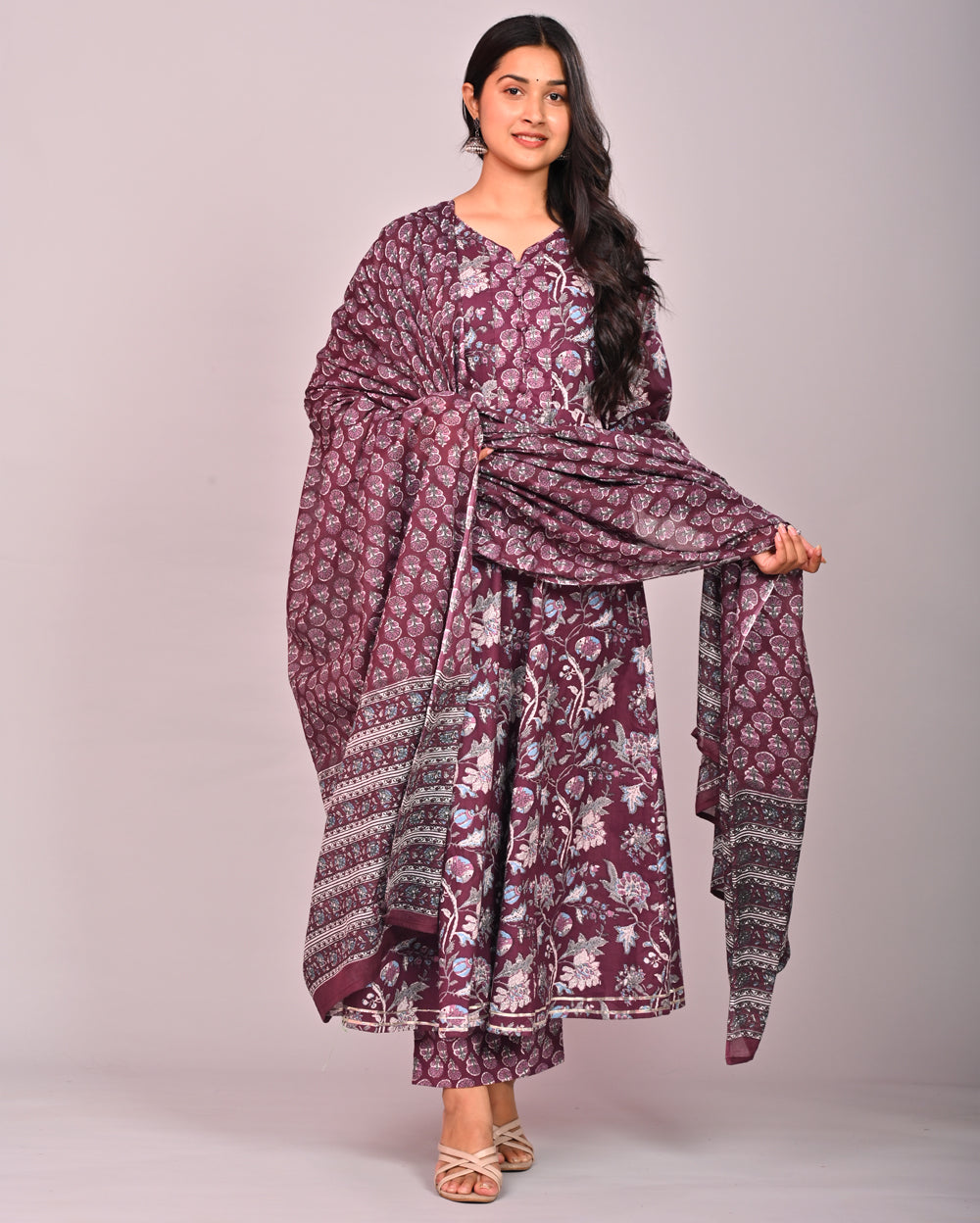 This kurta set With Dupatta is perfect for dressing up or down. The kurta is made of cotton and is printed with a beautiful design. It has a round neck and Gota Patti Work detail. The Bottom is made of Cotton fabric and is a lovely contrast to the kurta. Style this set with oxidized jewelry and a pair of ethnic chappals. You'll feel uniquely gorgeous!