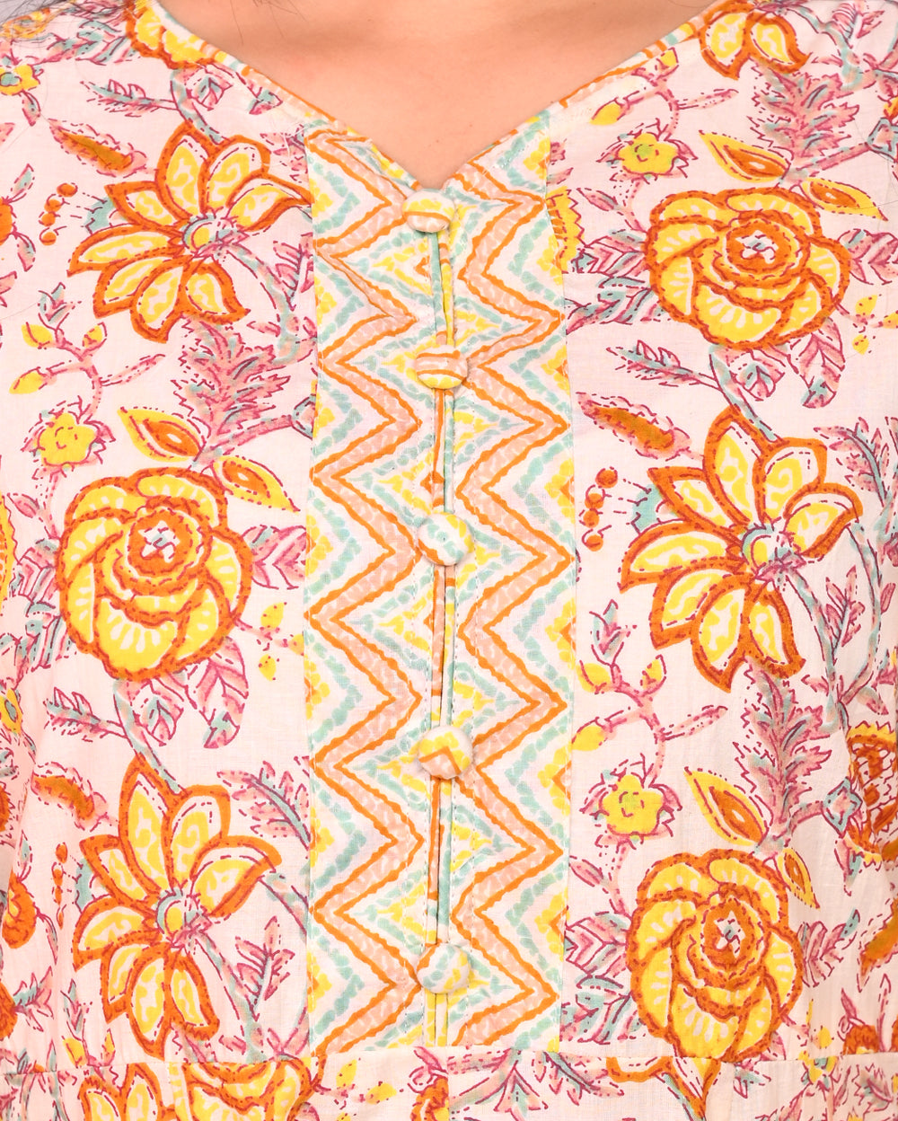 Yellow Floral Printed Cotton Anarkali Suit Set With Dupatta